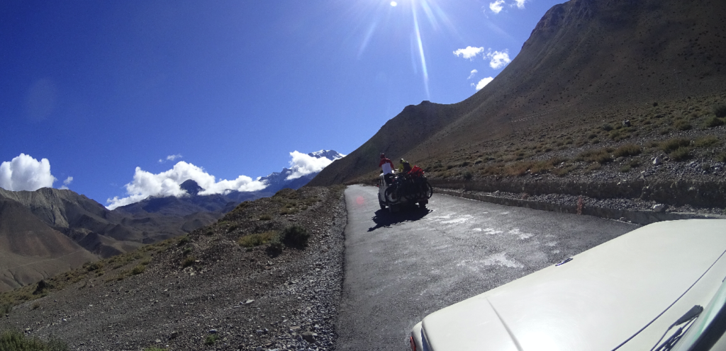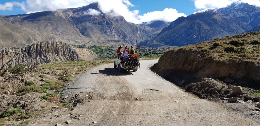 Setelah briefing dan menyiapkan sepeda, riding hari pertama dimulai. Perjalanan menuju Mukhtinat 3800 Mdpl menggunakan jeep 4×4. Sepanjang perjalanan ke Muhktinath lagi-lagi kami disajikan pemandangan alam yang luar biasa, susunan tanah liat purba, ladang penduduk yang cantik, kuil yang eksotis di kiri dan kanan pemandangan gunung es yang menakjubkan.