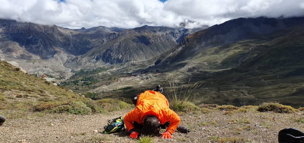 Dari titik loading di Muktinath menuju Lubra 4200 Mdpl, kami diuji karena pasokan oksigen yang tipis dan tanjakan yang terjal serta angin kencang membuat kami dihadapkan pada kemampuan fisik dan mental yang kuat. Untungnya kami sebelumnya sudah melakukan perjalanan darat selama 12 jam yang membuat kami beradaptasi dengan ketinggian. Alhamdulilah semua peserta lulus pada tahap ini. Riding pertama kami dengan tujuan Kalopani. Selama riding hamparan gunung es terlihat dan gunung – gunung cantik yang kami lewati, pada saat musim dingin menjadi gunung- gunung es.